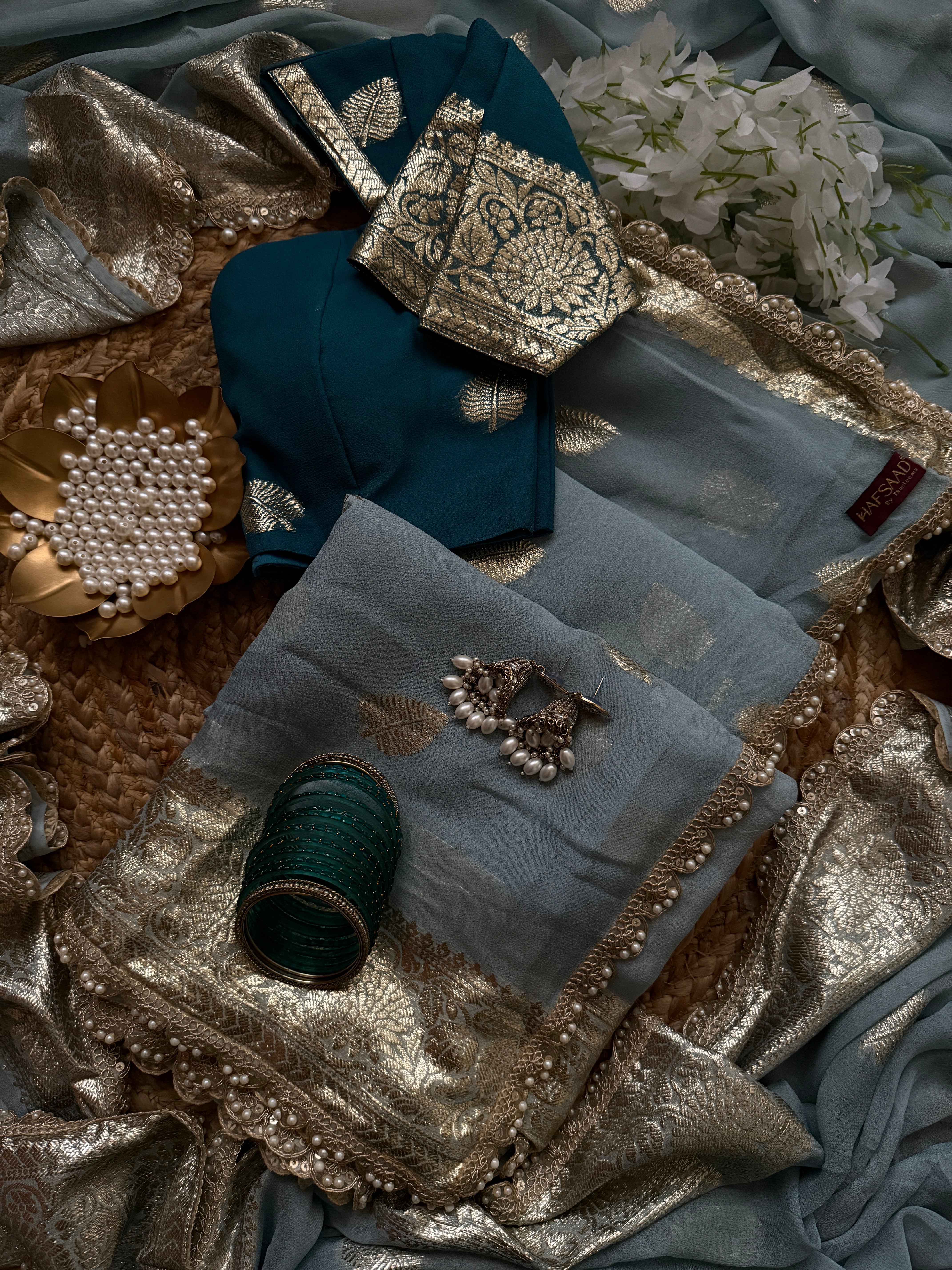 This ensemble captures the essence of carefree elegance, the fabric dances with delicate shimmer. Paired with a blouse that bursts with vibrant floral handwork, intricate blossoms weave a story of nature's enchantment.