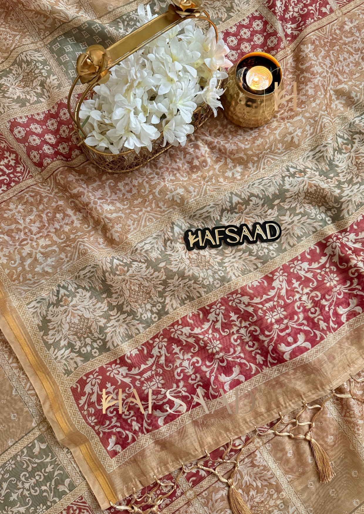 Embrace the allure of handmade luxury with Hafsaad’s hand embroidered saree on a pure tissue silk canvas paired with an exquisite heritage Banaras blouse offering unparalleled elegance and sophistication.