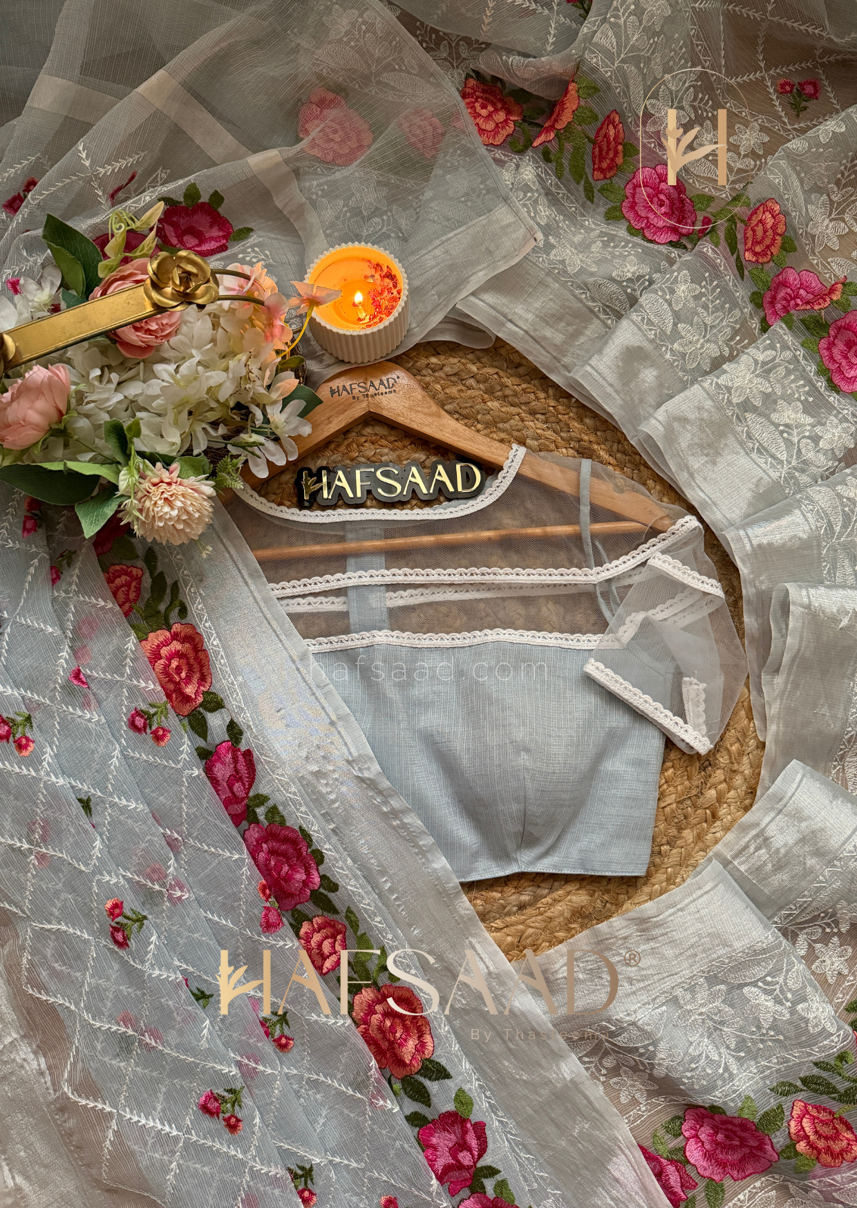 Tailored in luxurious fabric with a fluid fall and soft sheen, this saree captures light with every movement, ensuring you shine with ethereal brilliance